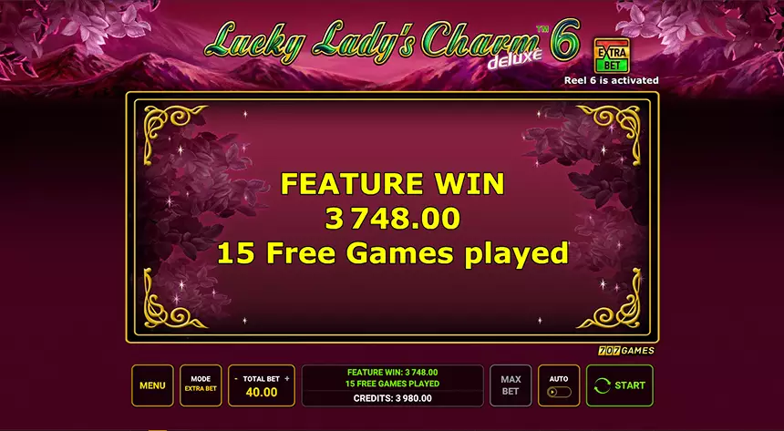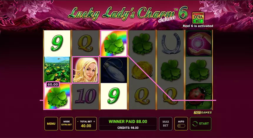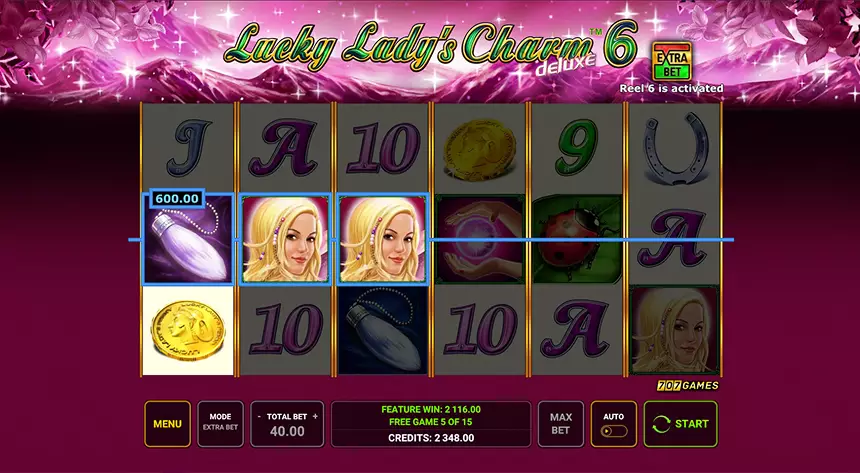 Το Lucky Ladys Charm Deluxe 6 διατηρεί τη γοητεία των προκατόχων του, ενώ προσθέτει πρόσθετες λειτουργίες για να κρατήσει τους παίκτες σε εγρήγορση. Μια διάταξη 5 κυλίνδρων και ένας πιθανός 6ος κύλινδρος που ενεργοποιείται από τη λειτουργία Extra Bet παρέχουν ευελιξία στο παιχνίδι. Τα πονταρίσματα κυμαίνονται από 0,01€ έως 20€ ανά περιστροφή, έως και 40€ με το Extra Bet. Με την προσθήκη του έκτου τροχού, η λειτουργία αυτή διπλασιάζει το ποντάρισμα και πολλαπλασιάζει τα κέρδη. Η αρχιτεκτονική του παιχνιδιού το καθιστά αναπαραγώγιμο σε διάφορες πλατφόρμες, προσφέροντας στους παίκτες μια διαφορετική εμπειρία παιχνιδιού.